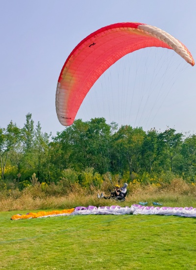 風從耳邊吹過,低頭就能看見濱湖濕地的綠毯鋪到天邊,遠處的巢湖閃著點點銀光。升到空中一定高度平穩時,教練開始讓同學們自己控制滑翔傘,并講解如何控制滑翔傘方向。在沒有教練的輔助下,同學們自己嘗試控制滑翔傘,從剛開始的小心翼翼到大膽地去嘗試,那是源自內心深處對于挑戰極限的勇氣!落地的那一刻,大家都不禁感慨:“原來膽怯的另一端,藏著這么棒的風景!”