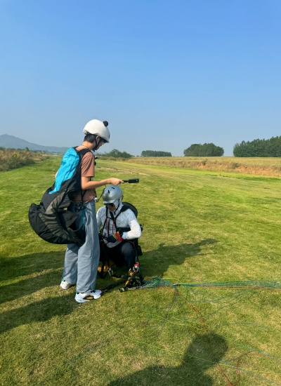到達了飛行營地,教練將同學們分好組,隨后一組一組帶至草坪,先是做好安全防護:帶好頭盔,隨后穿好滑翔傘的裝備。細心的教練在起飛前給每個同學檢查好裝備,并講解如何助跑,如何借風,并要求落地時盡量屈膝站穩。掌握了這些要領,就可以開啟這場空中之旅了!