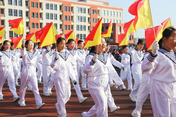 高中部的學子們表演的《旗幟下的征程》,則在紅旗舞動下,擺出“新中銳、新目標、新征程”以及“26”的字樣,詮釋了信念與榮耀的力量。