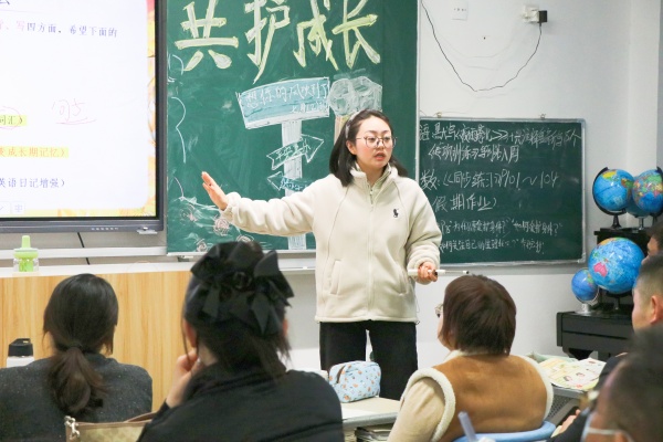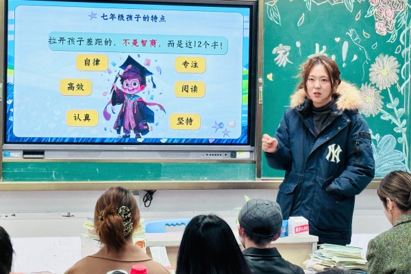 隨后,家長們移步至各班級教室,參加由班主任主持的班級家長會。各班教室布置得整潔而溫馨,黑板上的歡迎語、墻面上展示的學(xué)生作品,無不傳遞著各班的特色與活力。班主任們圍繞班級管理理念、本學(xué)期開學(xué)以來學(xué)生的整體表現(xiàn)等內(nèi)容,向家長們做了系統(tǒng)匯報?!昂⒆觽円淹耆m應(yīng)了初中生活的節(jié)奏,他們不僅在學(xué)業(yè)上人人有目標(biāo)、個個在進(jìn)步,在行為習(xí)慣、集體意識、心理狀態(tài)等方面也呈現(xiàn)出積極向上的面貌?!卑嘀魅蝹兘Y(jié)合日常點滴,分享了學(xué)生在課堂互動、課外活動、同學(xué)交往中的成長故事。各科任老師也逐一發(fā)言,老師們從學(xué)科特點、學(xué)習(xí)方法、個體關(guān)注等角度,與家長進(jìn)行了細(xì)致溝通。交流環(huán)節(jié)中,家長們敞開心扉,就青春期教育、學(xué)習(xí)動力提升、心理情緒調(diào)節(jié)等話題,與老師展開了深入探討。雙方共同分析問題,分享經(jīng)驗,在互動中逐漸凝聚共識:只有家校同心、攜手共育,才能更好地為孩子的成長護(hù)航。