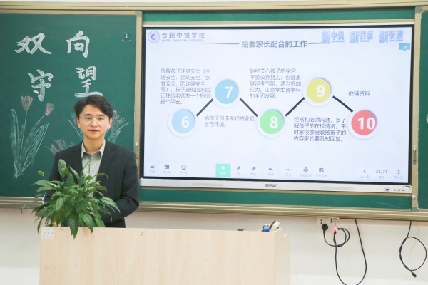 合肥中銳學(xué)校執(zhí)行校長孫幫磊首先分析了當前高考改革新形勢與政策走向,幫助家長把握升學(xué)動態(tài)。隨后詳細闡述了我校的辦學(xué)目標——“辦有品質(zhì)學(xué)校,做有溫度教育”,并介紹了我校精細化管理的具體措施,強調(diào)學(xué)校始終以學(xué)生成長成才為中心開展各項工作。